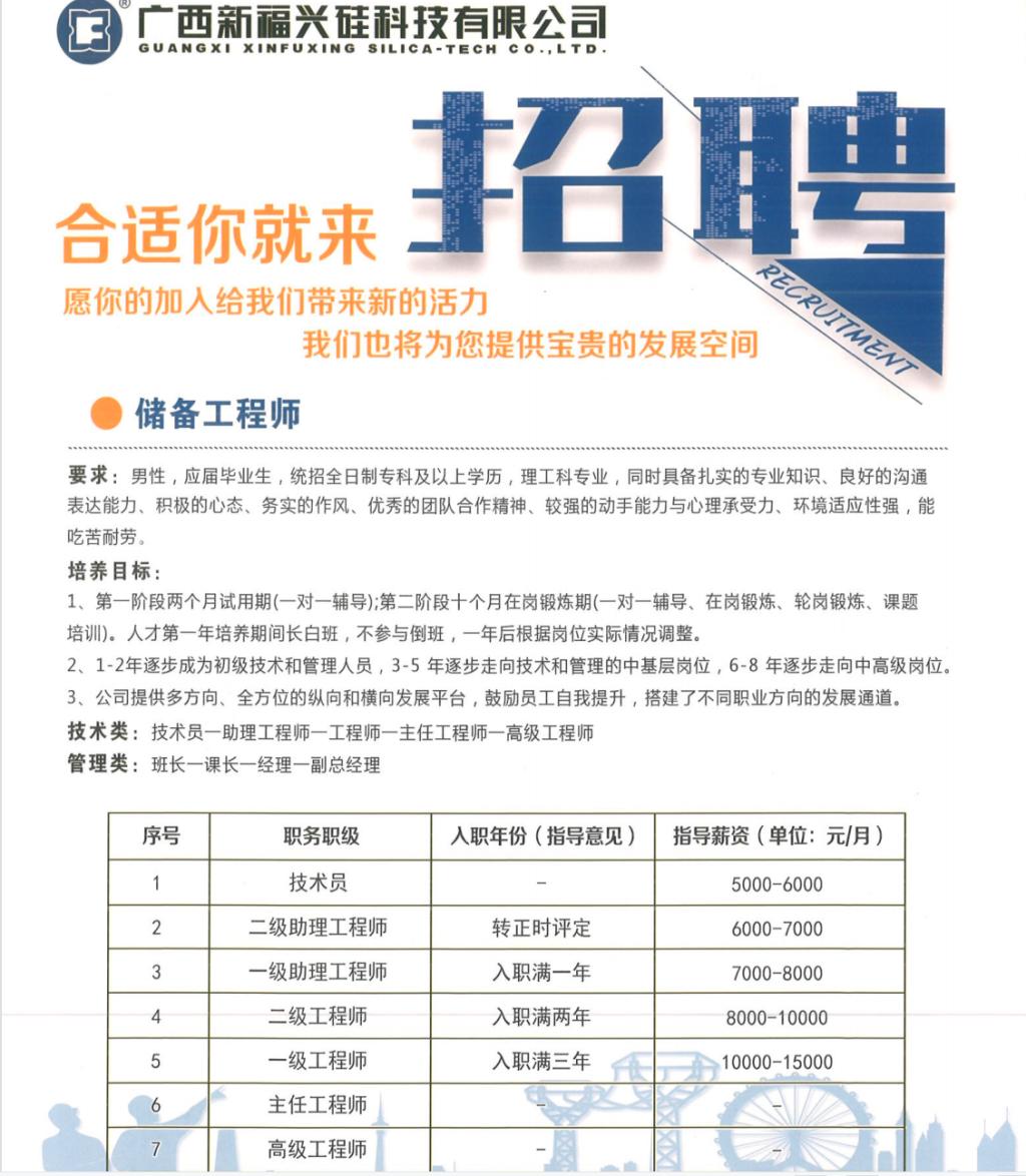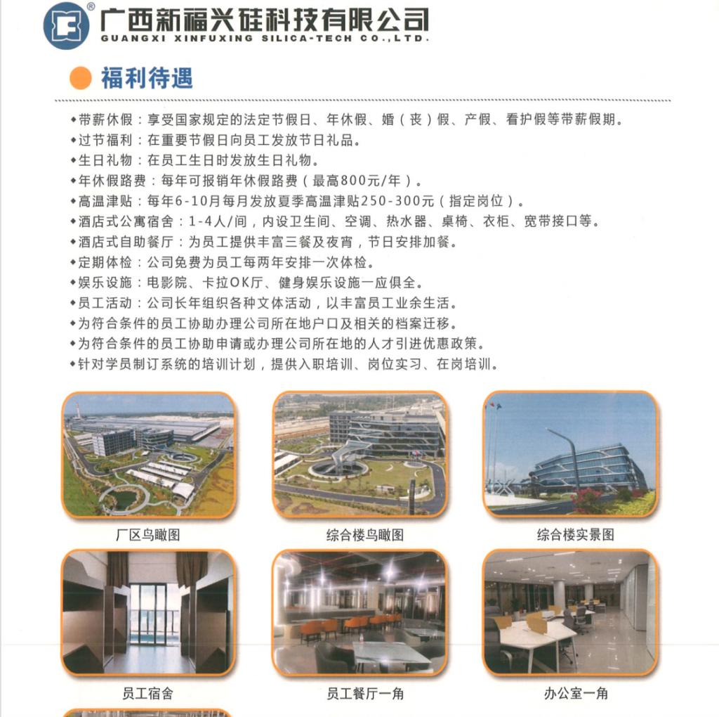 广西新福兴硅科技有限公司 位于广西北海市合浦县白沙镇东港产业园,是新福兴玻璃工业集团有限公司旗下全资子公司。【招聘岗位】技术员:1.试用期两个月 2.在岗锻炼期十个月 3.薪资5k-6k【岗位职责】、【任职要求】详见招聘文件。